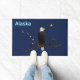 Uma águia careca varreu o céu de sua perca em um galho de árvore; sobreposto a uma bandeira do Alasca. Leitura de texto, "Alaska" aparece em azul e branco brilhantes.