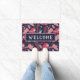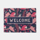 Ara Parrot Red Tropical Pattern Bem-Vindo Doormat. Padrão de ara sobre fundo azul escuro com folhas tropicais em cores verde, vermelha e bege. Excelente para amantes de papagaios e donos de papagaios. Você pode adicionar seu texto. Também está disponível sem o texto - verifique a coleção abaixo.