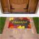 Tipografia agradecida cercada por folhas de árvores de carapaças do outono em cores de queda amarelas laranja vermelhas em fundo texturizado de aquarela marrom. Ideal para decoração de Ação de Graças