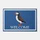 Uma pintura digital de um Puffin Atlântico junto com a leitura de texto, "BEM-VINDO." A Puffin do Atlântico (Fratercula arctica) se alimenta principalmente por mergulho na água. Criam-se em grandes colônias em penhascos costeiros ou ilhas offshore no Atlântico Norte. Eles derramaram as partes coloridas das suas contas após a época de reprodução, deixando um bico menor e mais aborrecido. Suas asas curtas são adaptadas para nadar com uma técnica voadora sob água. No ar, batem suas asas rapidamente (até 400 vezes por minuto) em um voo rápido, muitas vezes voando baixo sobre a superfície do oceano.