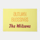 Uma adorável morada de outono, esta design mostra um fundo amarelo com "Abençoações de outono" escritas em fonte laranja divertida. Por baixo está o nome da sua família escrito em lindas letras burgundy. Personalize seu travesseiro hoje!