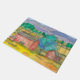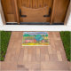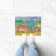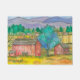 Uma porta com uma paisagem de outono com cascas vermelhas desbotadas rústicas cercadas por campos de fazenda e árvores verdes-azuis com montanhas roxas na distância desenhada com tinta sépia e pintada com aquarela.