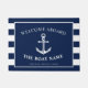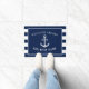 Um doormat que caracteriza uma âncora náutica e o nome feito sob encomenda do proprietário do barco e do barco. Nos lados são o marinho e as listras brancas para complementar o texto dianteiro.