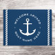 Matriz de porta com âncora náutica branca e texto personalizável "bem-vindo a bordo" e seu nome de barco flanqueado por bordas de corda. Design branco sobre fundo azul escuro.