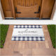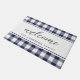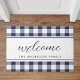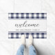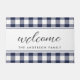 Tapete de boas-vindas em estilo fazenda personalizado com o nome da família em padrão xadrez búfalo azul-marinho e branco.
