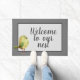A design de porta artística e moderna mostra "Bem-vindo ao nosso ninho" o texto centrado em cinzas era bordado. Gráfico de aves amarelas de cor amarela-puffy puffy