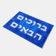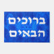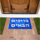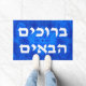 Leitura em texto branco hebraico, "B'ruchim Haba'im" (ב ר י ם כ ה ב א ו י, em boas-vindas), numa imagem fractal serena, azul e branca, que lembra penas ou nuvens. Há também uma pequena Estrela de David (Magen David) no centro.