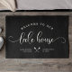 Escrito moderno, chic push, que lê BEM-VINDO À NOSSA CASA LAKE em uma design motriz de tipografia. Excelente de decoração personalizada da casa do lago para sua casa longe de casa. Tanto romântico como na moda, nosso tapete de porta preta apresenta uma doce ilustração de canoa entre sua localização e o ano estabelecido.