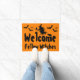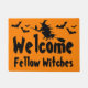 Uma bela porta do Halloween com uma bruxa voadora, seus morcegos familiares e voadores que diz: Bem-vindas Bruxas Fellow.