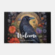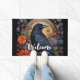 Bem-vinda à porta com um corvo preto. Um arco amarelo atrás. Cercado por flores vermelhas e roxas. Legal vibração gótica.