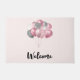 Uma porta de boas-vindas com uma ilustração de um monte de balões em cor rosa e cinza prateada.