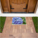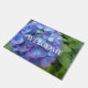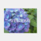 Porta de boas-vindas decorativa que mostra uma foto de pétalas de flores de Mophead Hydrangea azul e folhagem verde. Um design floral adorável! Utilizar no interior ou em áreas de acesso cobertas. Selecione o tamanho da porta.
