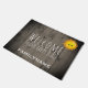 País bonito rústico, doormat bem-vindo personalizado perfeito para uma cabine nas madeiras velhas, fundo esmaecida, rústico da madeira do celeiro. Nome de família personalizado na parte inferior nas letras brancas, elegantes. Lê, "dê boas-vindas a nosso lugar feliz" em letras rústicas no meio. Um sol do kawaii no canto superior sorri em visitantes. Boa vinda rústica, do divertimento para a família e amigos. Estilo rústico do país, presente monogrammed do housewarming para a família ou presente original do chá de casamento para os newlyweds. Nota: Todas as imagens são imprimidas. Madeira nao real. Nós temos uns doormats bem-vindos mais rústicos dos lotes em nossa loja em linha de Zazzle.com/angela65.