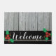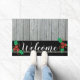 O Doormat de madeira cinzento rústico da boa vinda do feriado com o brilho das bagas e da prata do azevinho alinha no preto que adiciona um toque festivo.