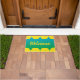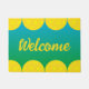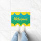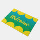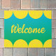 Bola de Pickleball bem-vinda em amarelo e verde. O design inclui uma fileira de bolas amarelas de picleball nas bordas superior e inferior e um plano de fundo azul-esverdeado.