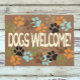 A pata de cães multicolores imprime ao redor da mensagem de boas-vindas aos cães em uma fonte divertida. Você ama visitantes de cachorros? Sua casa está cheia de cachorros? Cumprimenta-os adequadamente com um tapete de boas-vindas divertido. Este é também um excelente para negócios relacionados a cães, como comilão, babá de estimação ou escritório de veteranos.