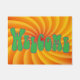 Retro 1970 hippie e trippy Welcome mat color boho style. Bem-vindo está em verde em uma fonte vintage de 60/70 em um fundo de raios solares psicodélicos girados em laranja vívida e amarelo. Faça uma declaração corajosa e colorida!