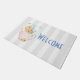 Bem-vinda à porta com uma ilustração caprichosa. Um bule cor-de-rosa com um pequeno coração cor-de-rosa no centro e um buquê de flores. Delicar borboletas coloridas com sabor a flecha. Colocado sobre uma cinza e fundo listrado branco.