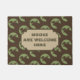 Esta é uma esteira de porta bonito que seja perfeita para uma casa da cabine ou da floresta. Caracteriza um fundo de uma silhueta marrom da cabeça dos alces dentro de um quadro verde do círculo repetido durante todo o teste padrão. Há uma etiqueta de harmonização no centro com seu texto feito sob encomenda. Atualmente diz que os "ALCES SÃO BEM-VINDOS AQUI" mas você pode facilmente o personalizar a seu próprio texto