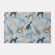 Cães Grisons italianos bonitos sentam-se e ficam de pé com cinzas, casacos pretas, negras, vermelhas e azuis, com ossos de cão espalhados e padrões de pegadas.
