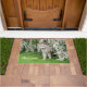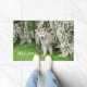 Um filhote de Malamute, jovem no Alaska, com um casaco duplo de pelúcia, parado em um campo de grama com um arbusto branco florescente em primavera. Foto de cachorro fofo tirada por Katho Menden, esta porta é uma ideia de presente para amantes de cachorros e animais de estimação.