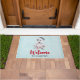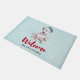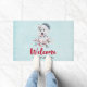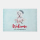 Uma porta bem-vinda com uma pintura de aquarela branca e fofa de um cão rouco vestindo um chapéu azul de Papai Noel.