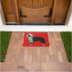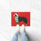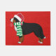 Festa de Natal Festiva Cachorro da Montanha Bernese vestido com chapéu Santa e cachecol verde e branco segurando enfeites de natal vermelha em sua boca. Uma bela porta de natal vermelha de Natal para amantes de berner!