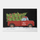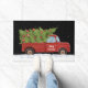 Caminhão vermelho retrógrado com texto de Feliz Natal e uma árvore de Natal verde. A cor preta do plano de fundo pode ser alterada. O texto é editável.