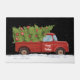 Caminhão vermelho com texto de Feriados Felizes e árvore de Natal verde. A cor preta do plano de fundo pode ser alterada. O texto é editável.