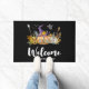 Um tapete de porta bem-vindo com uma bela imagem de uma casa de abóbora assombrada com um chapéu de bruxa no topo e fantasmas e morcegos voando por aí.