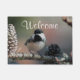 Os cones do Chickadee e do pinho com fundo hued do rosa do delicado com texto que lê a "boa vinda" mas sente-a livres mudar ou remover se você gosta.