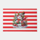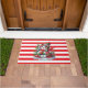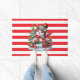 Christmas door mat is shown with a cute snowman and red and white stripes print.