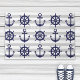 Este design decorativo apresenta uma âncora azul marinho escura e uma roda de barco com cinzas e listras brancas. A ilustração náutica cria uma porta moderna e única com texto personalizado e cor de fundo favorita.