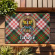 Crachá da crista Clan Carnegie rodeado por uma correia e fivela sobre o fundo do tartan vestido. Custom Text.
