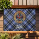 Crachá da crista Clan Clark rodeado por uma correia e fivela sobre fundo tartano. Texto personalizado.