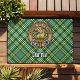Crachá de crista de leão Clan Currie cercado por uma correia e fivela sobre fundo tartano. Custom Text.