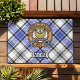 Crachá da crista Clan Hannay cercado por uma correia e fivela sobre fundo tartano. Custom Text.