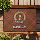Crachá da crista Clan MacAlister rodeado por uma correia e fivela sobre fundo tartano. Custom Text.