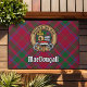 Crachá da crista Clan MacDougall rodeado por uma correia e fivela sobre fundo tartano. Custom Text.