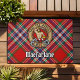 Crachá da crista Clan MacFarlane rodeado por uma correia e fivela sobre fundo tartano. Custom Text.