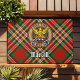 Crachá da crista Clan MacGill rodeado por uma correia e fivela sobre fundo tartano. Texto personalizado.