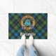 Crachá da crista Clan MacKenzie rodeado por uma correia e fivela sobre fundo tartano. Texto personalizado.