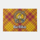 Crachá da crista Clan Macmillan, rodeado por uma correia e fivela sobre o fundo do tartan vestido. Custom Text.