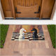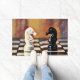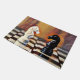 Esta design de porta de xadrez apresenta cavaleiros clássicos de peça de xadrez num conselho de xadrez com sotaques cor laranja e amarelo.