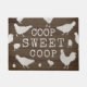 Um país bonito dá boas-vindas a tapete com galinhas, ovos e pintinhos. "Coop Sweet Coop" pode ser personalizado com sua própria mensagem. Uma porta divertida para as galinhas que residem na sua casa de galinha. Este tapete de boas-vindas do pátio faz um presente perfeito para qualquer um que ama galinhas ou vive numa fazenda familiar. Visite o Doodle World de Jenn para ver as portas de um amante de os animais ainda maior e a decoração original da casa de fazenda.