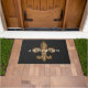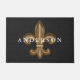 Flor de lis dourada extravagante do olhar do ferro forjado no centro. O fundo tem branco muito pequeno um teste padrão scalloped sobre sua escolha da cor do fundo e do texto personalizado do nome de família. Este doormat exsuda o refinamento e faria uma grande impressão em seus convidados da casa enquanto são dados boas-vindas a sua casa!