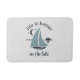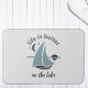 Um tapete de banho bonito, perfeito para uma casa de lago ou para aqueles que simplesmente adoram velejar. Com uma cinza muito clara, há uma imagem de um barco à vela azul e cinza e a tipografia da cinza escura diz "A vida é melhor no lago".