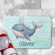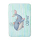 Este tapete de banho personalizado apresenta uma baleia branca fofinha num vibrante esquema de cor rosa e azul nadando brincando com um chapéu minúsculo.