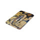 Fotografia de uma píton de barriga amarela enrolada na esfera, impressa nas bordas do tapete.