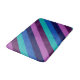 Um tapete de banho de tamanho médio com um padrão colorido de faixas diagonais em legal tom, azul-oceano, azul-marinho, roxo de ameixa e lavanda.